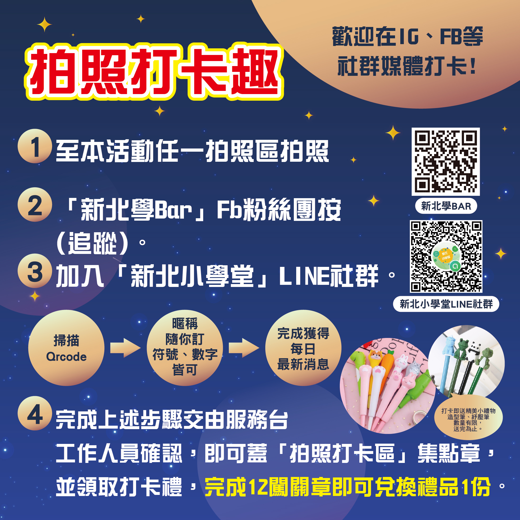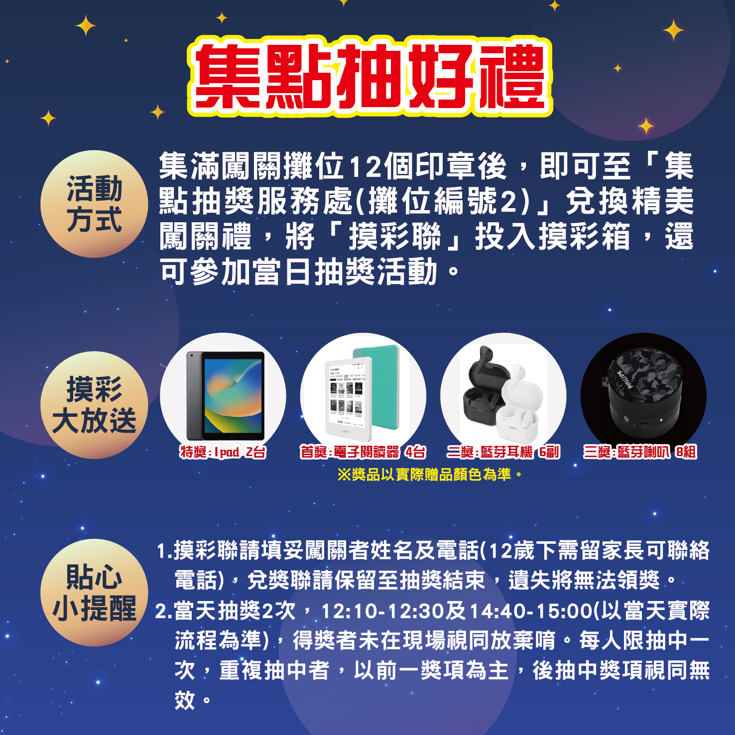 五、活動形式:本年度新北閱讀節規劃行動書、61個跨域閱讀攤位、主舞臺活動,並設計闖關卡,集滿可憑闖關卡兌換小禮物並參與摸彩。(關關有獎品,參與摸彩即可中大獎)