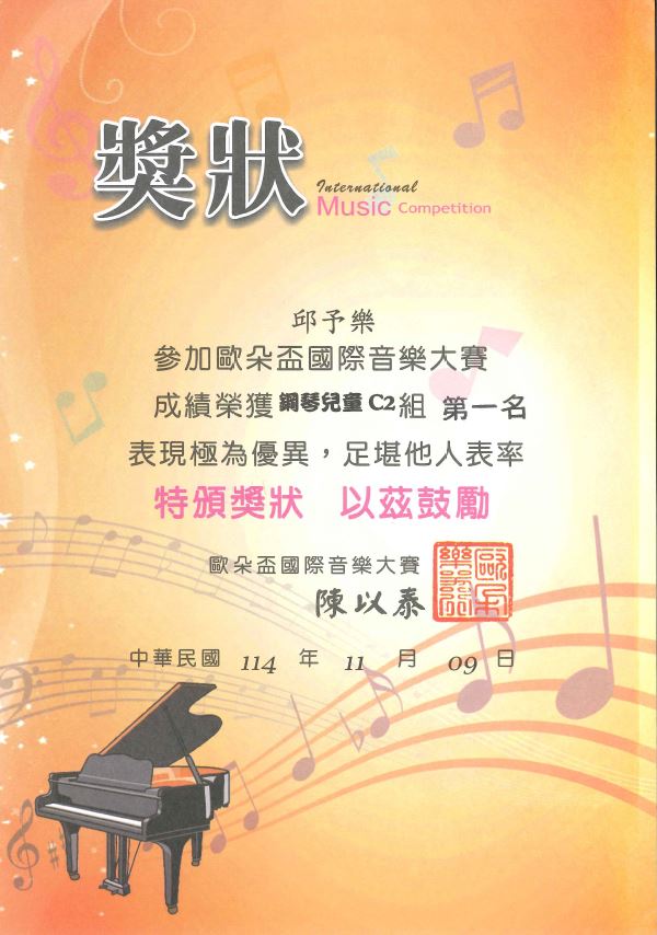 賀!本校三年1班邱予樂參加歐朵國際音樂大賽,榮獲鋼琴兒童C2組第一名!